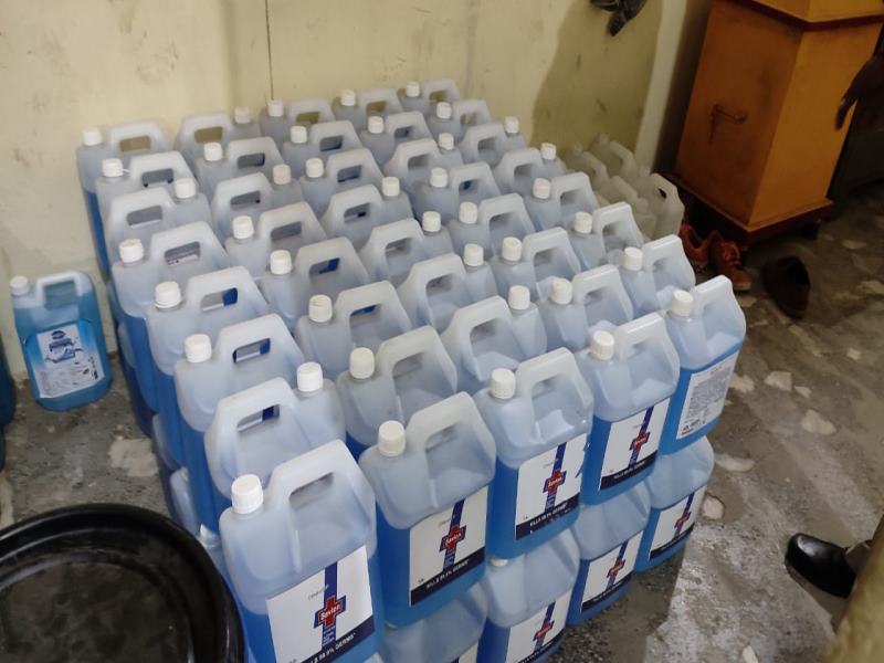 रातीबड थाना प्रभारी सुदेश तिवारी के मुताबिक पुलिस को सूचना मिली थी कि इलाके स्वच्छ हर्बल कंपनी कलखेड़ा रोड द्वारा बड़े पैमाने पर नकली सैनिटाइजर बनाया जा रहा है। इस सैनिटाइजर को कैन में पैक करते हुए नामी-गिरामी कंपनी के स्टीकर लगाकर बड़े दामों पर बेचकर अवैध लाभार्जन किया जा रहा है। सूचना पर उक्त ब्रांडेड कंपनी के अधिकारियों को साथ लेकर उक्त फैक्ट्री पर छापा मारा गया। मौके से 156 नग पांच लीटर की कैन में 760 लीटर सैनिटाइजर जब्त किया गया। आरोपित फैक्ट्री संचालक अक्षय शर्मा निवासी जेके पार्क कोलार रोड एवं फाइज आलम निवासी पुल वोगदा के खिलाफ अपराध पंजीबद्ध किया गया।