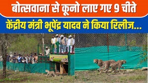 केन्द्रीय वन एवं पर्यावरण मंत्री यादव ने बोत्सवाना से आये 9 चीतों में से तीन चीतों को प्रतीकात्मक रूप से क्वारंटीन के लिए बनाये गये बाड़ों में रिलीज किया। बता दें भारत में चीतों की पुनर्बसाहट के लिए तीन वर्ष पूर्व शुरू हुए चीता प्रोजेक्ट के तहत बोत्सवाना से लाये गये 9 चीते शनिवार को सुबह लगभग 9.30 बजे कूनो नेशनल पार्क पहुंचे। वायुसेना के तीन हैलीकॉप्टर से ग्वालियर एयरपोर्ट से इन चीतों को कूनो नेशनल पार्क में एयरलिफ्ट किया गया। इन चीतों में 6 मादा और 3 नर चीते शामिल है। केन्द्रीय वन एवं पर्यावरण मंत्री ने चीता रिलीज कार्यक्रम उपरांत बोत्सवाना से आये चीता विशेषज्ञ दल से भेंट कर चर्चा की, साथ ही उन्हें कूनो नेशनल पार्क की ओर से स्मृति चिन्ह भेंट किये।